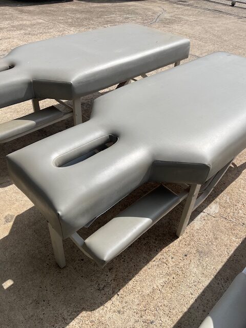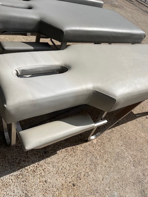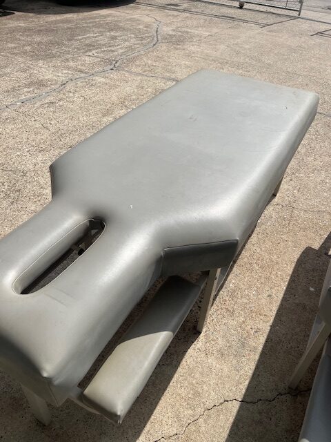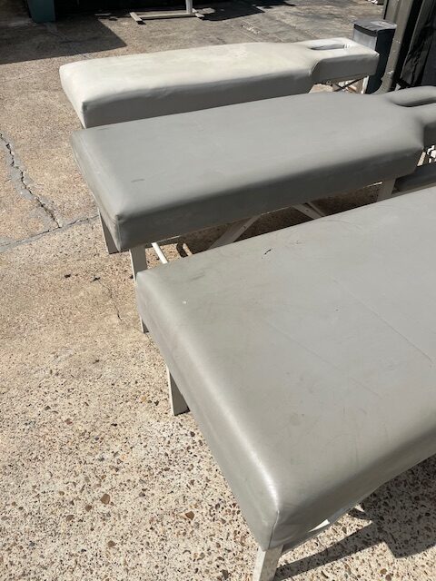 Pre-owned. In good condition. AS IS. Flat adjustment benches with face slot. Headrest paper holder included. Does not include headrest paper. New upholstery is an additional cost. 6 in stock.
