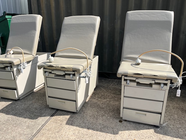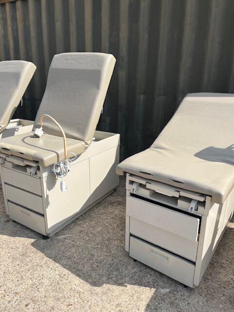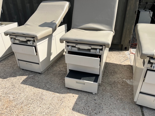 Pre-owned Exam Tables. In good condition. Upholstery can be changed to any color at time of purchase. Delivery not included. Free pick up at warehouse. Check for availability. First come first serve.
