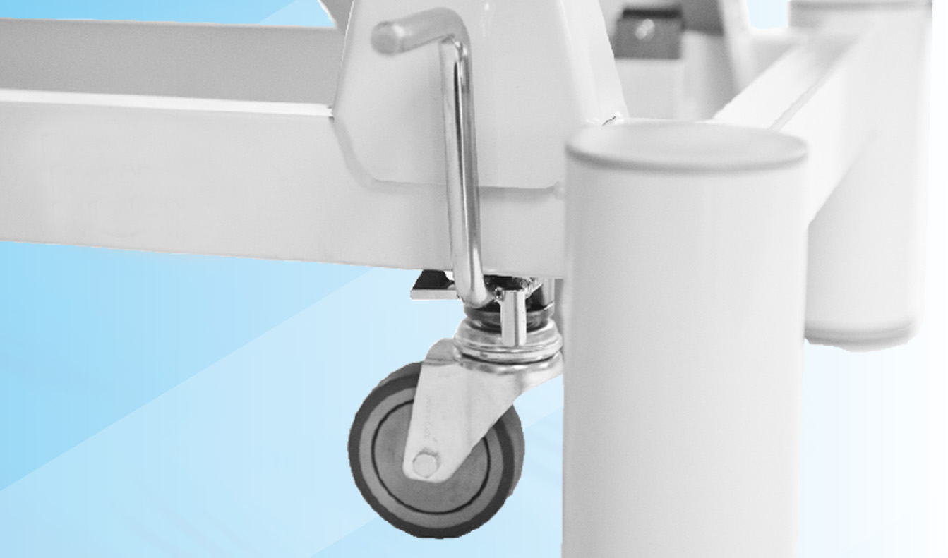 The removable wheel set can be raised and lowered for easy moving – and locked for safety and stability when in use for treatment.