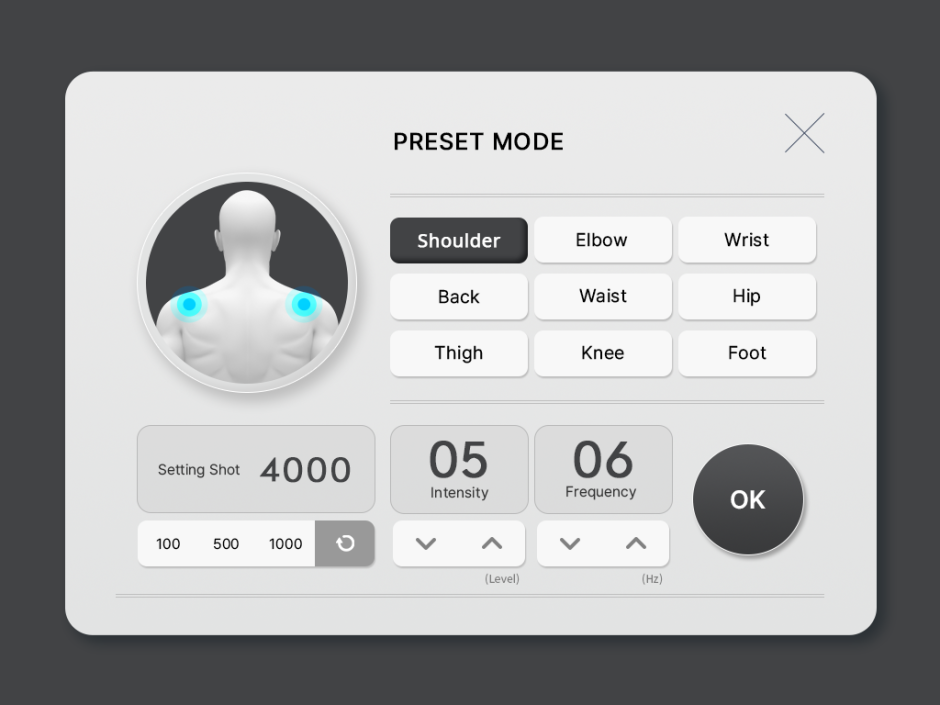 Built-in preset modes allow clinicians to select common anatomical regions directly from the touchscreen interface, streamlining setup for targeted musculoskeletal applications. Predefined parameter ranges support efficient, repeatable treatments while preserving full control over intensity, frequency, and shot count.